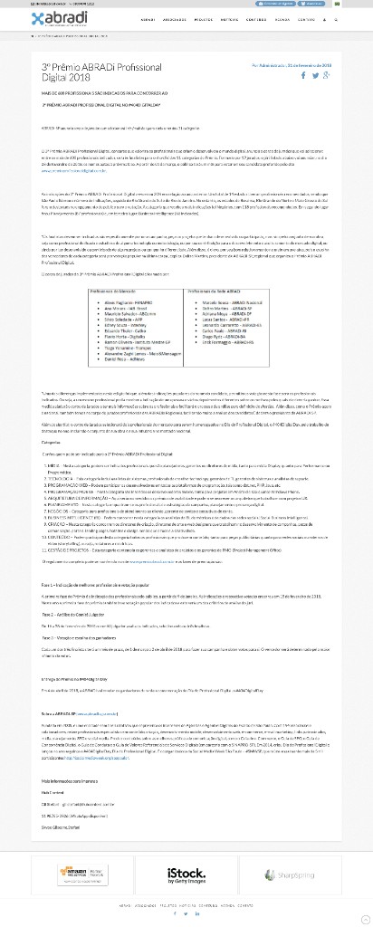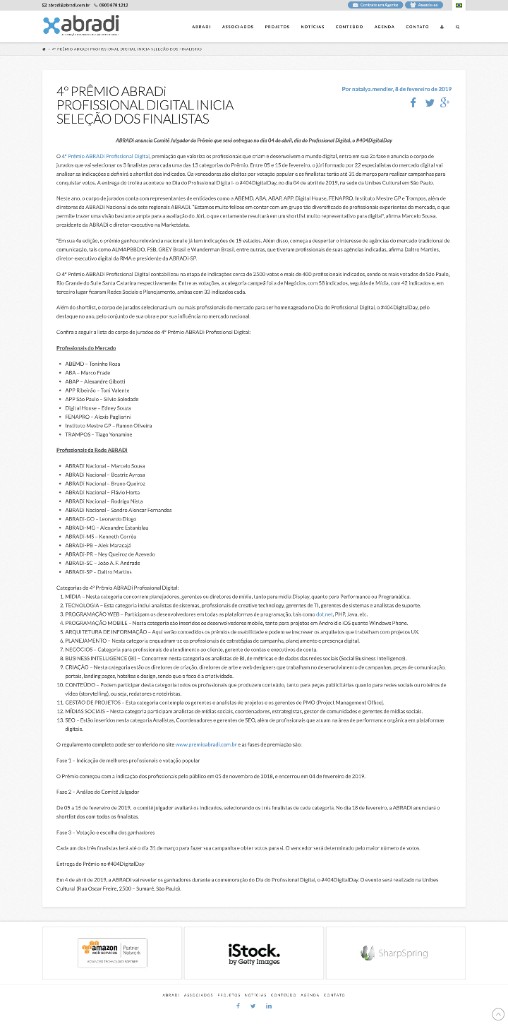 Destaque3º Prêmio ABRADI Profissional Digital 2018ABRADI · 21 de fevereiro de 2018Listado entre os Profissionais do Mercado no prêmio nacional que reconhece contribuições ao mercado digital.