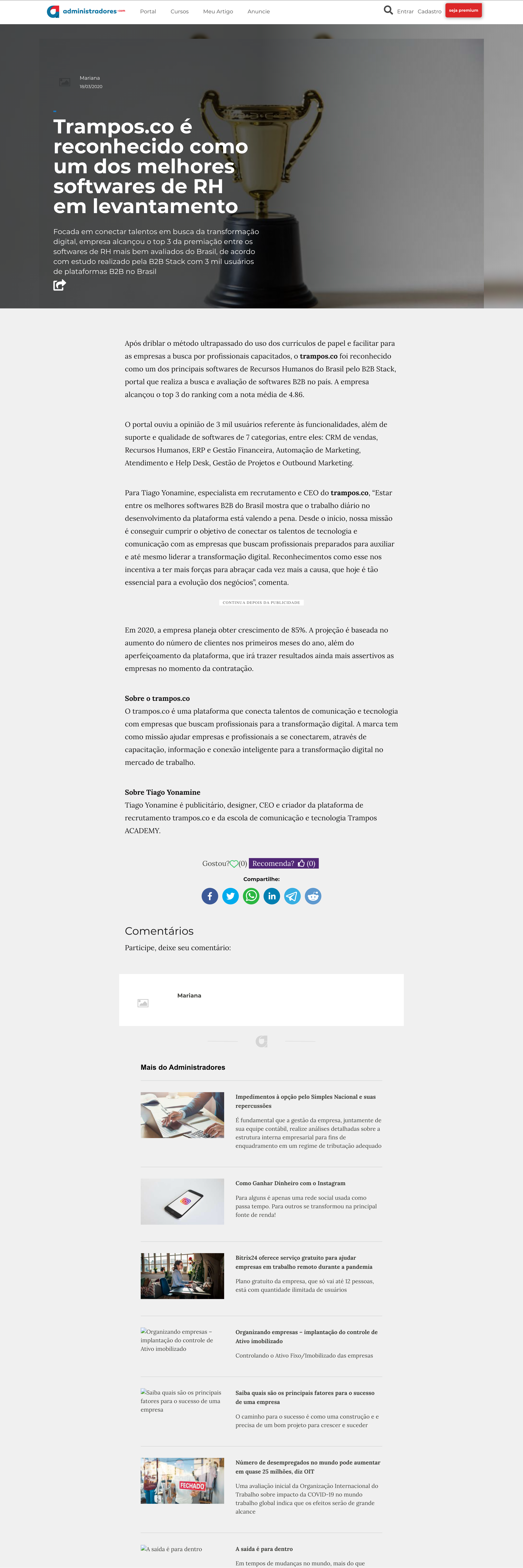 Destaquetrampos.co é reconhecido como um dos melhores softwares de RH em levantamentoAdministradores.com · 18 de março de 2020Matéria sobre o top 3 do ranking B2B Stack (nota 4,86). Tiago Yonamine citado como CEO e especialista em recrutamento.