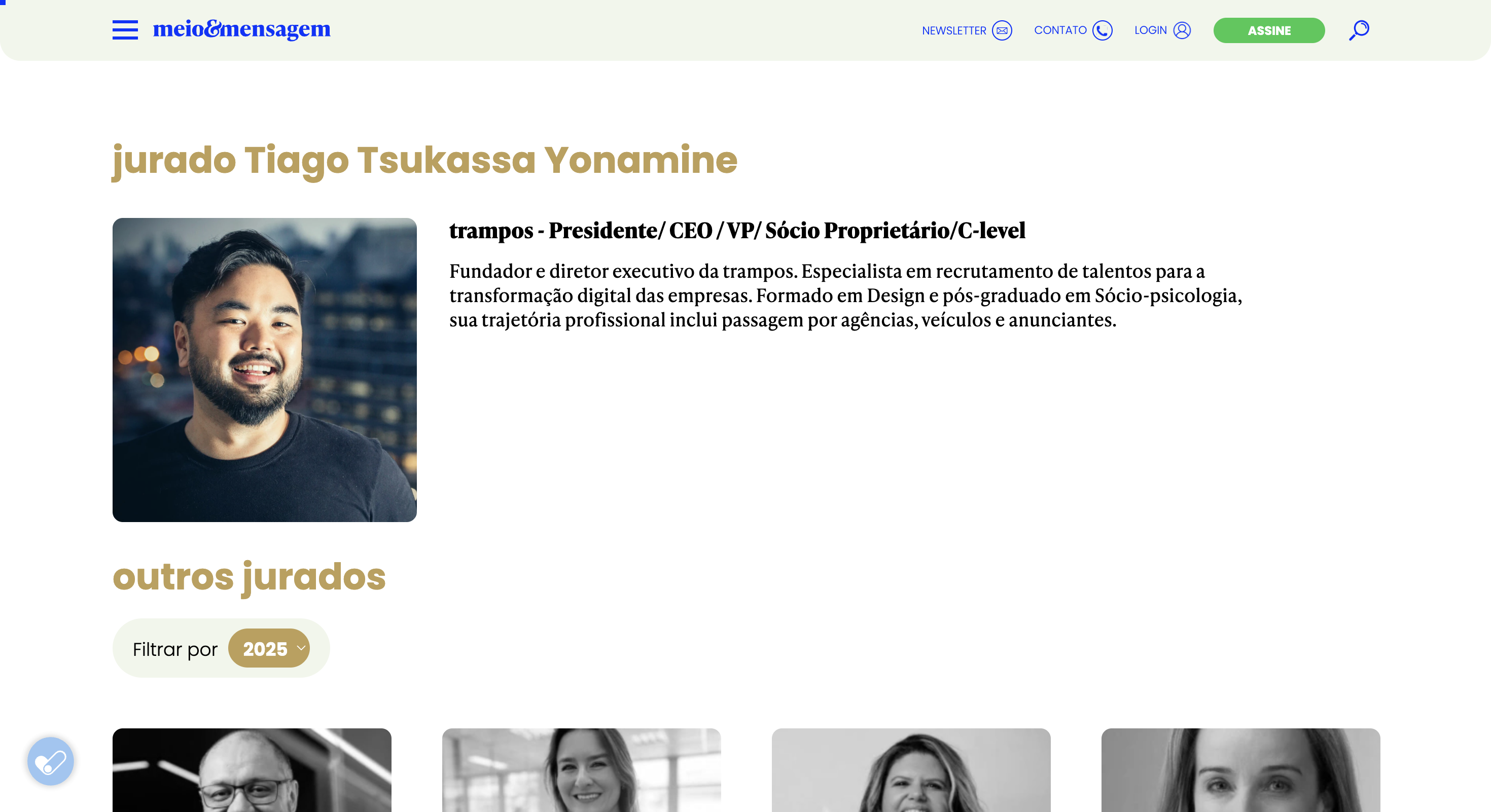 DestaqueJurado do Effie AwardsEffie Awards (Meio & Mensagem) · 1 de janeiro de 2025Listado como jurado do Effie Awards Brasil. Perfil destaca papel como fundador e diretor executivo da trampos, especialista em recrutamento para transformação digital.