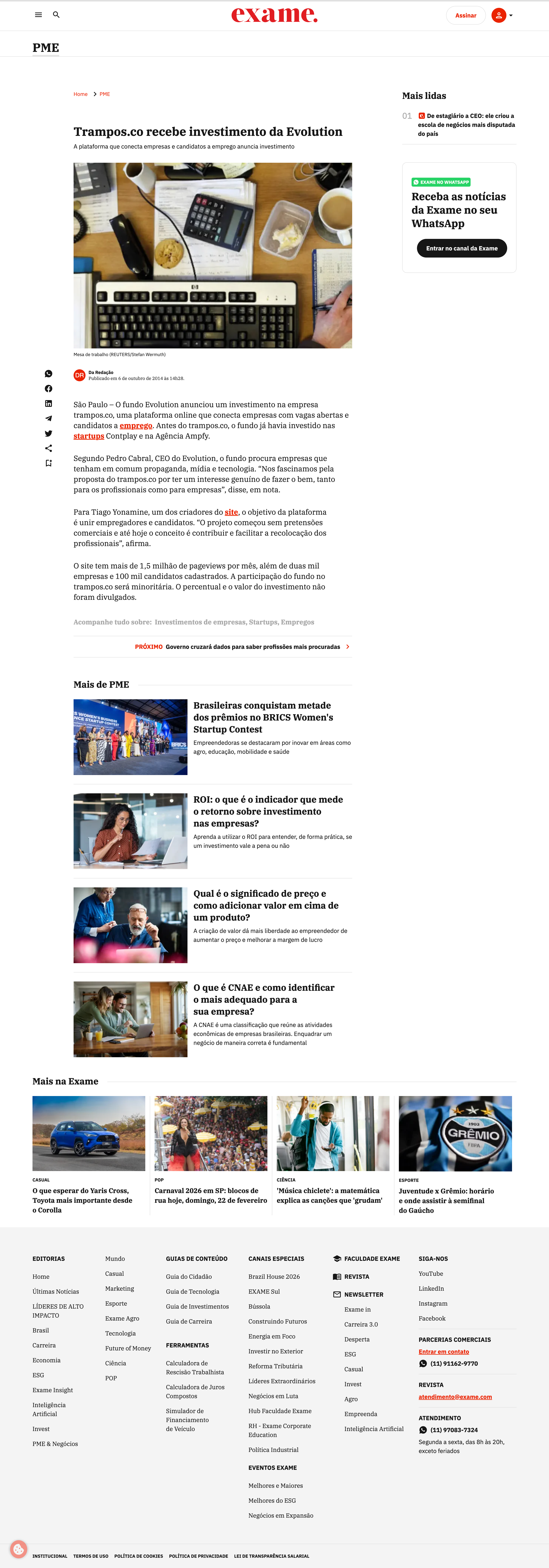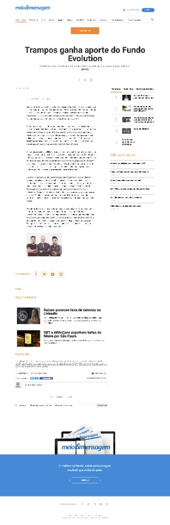 Destaquetrampos ganha aporte do Fundo EvolutionMeio & Mensagem · 6 de outubro de 2014Matéria sobre o investimento do Fundo Evolution (XP Inc.) na trampos.co, plataforma de vagas e cursos para economia criativa.