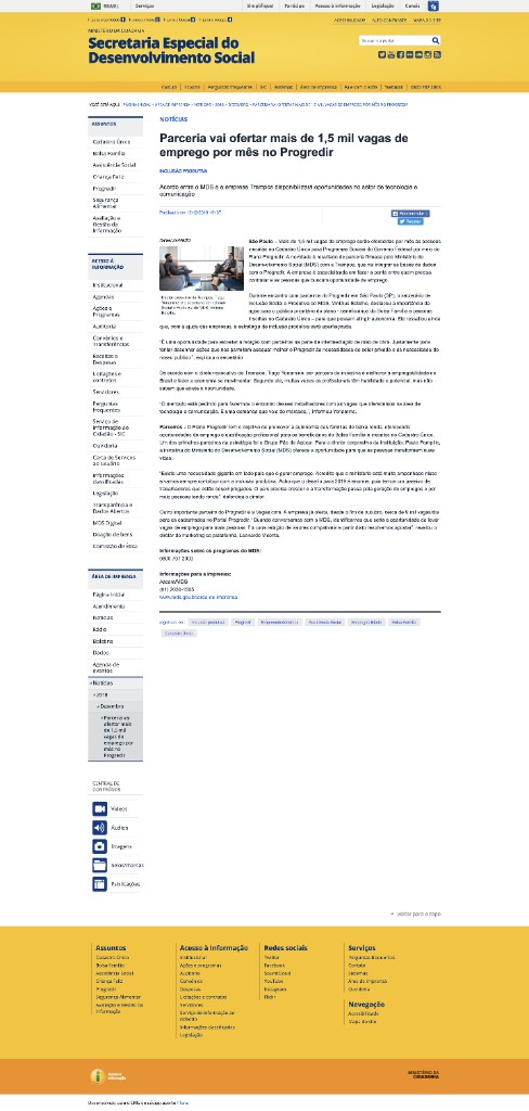 DestaqueParceria vai ofertar mais de 1,5 mil vagas de emprego por mês no ProgredirSecretaria do Desenvolvimento Social (MDS) · 1 de dezembro de 2018Acordo entre o MDS e a trampos.com para disponibilizar oportunidades no setor de tecnologia e comunicação. Citação como diretor executivo.