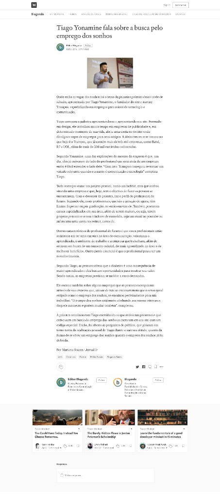 DestaqueTiago Yonamine fala sobre a busca pelo emprego dos sonhosBlogando (Medium) · 2 de outubro de 2018Artigo sobre a trajetória profissional, fundação da trampos e insights sobre como alcançar o emprego dos sonhos.