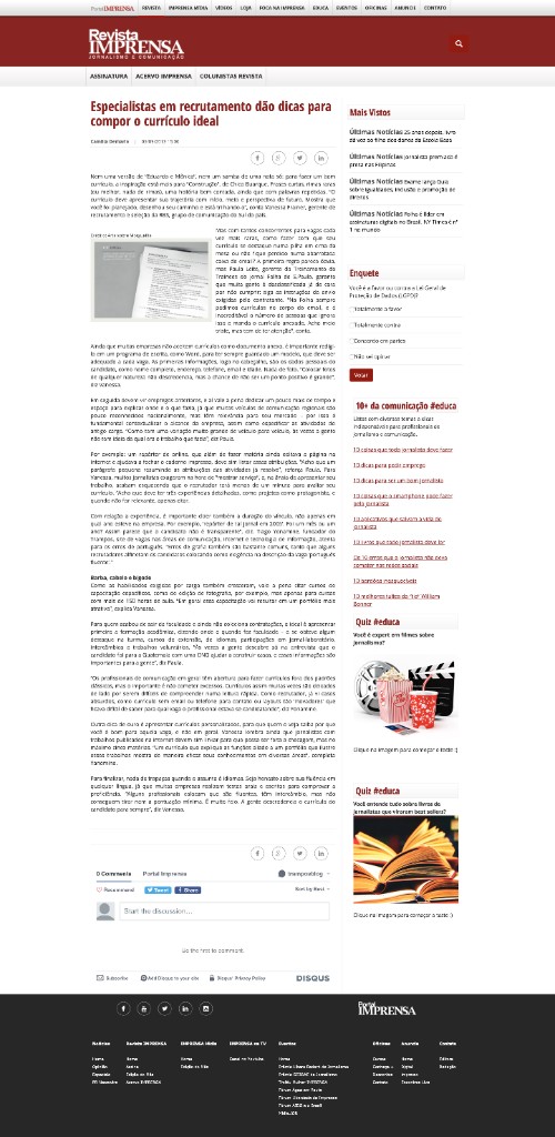 Especialistas em recrutamento dão dicas para compor o currículo idealPortal Imprensa · 5 de setembro de 2013Citação como fundador do trampos e especialista em recrutamento, com três declarações sobre erros de português, currículos fora do padrão e personalização de currículos.