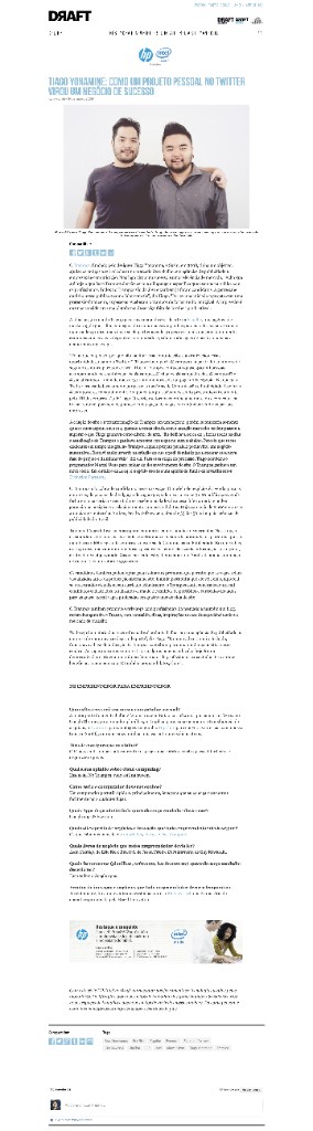 DestaqueTiago Yonamine: como um projeto pessoal no Twitter virou um negócio de sucessoProjeto Draft · 2 de setembro de 2014Matéria de capa sobre a origem da trampos a partir de um projeto pessoal no Twitter.
