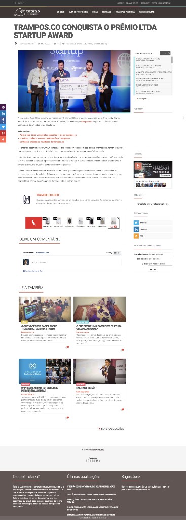 Destaquetrampos.co conquista o Prêmio LTDA Startup AwardTutano · 7 de abril de 2019Matéria sobre a conquista do LTDA Startup Award pela trampos.co na Futurecom.