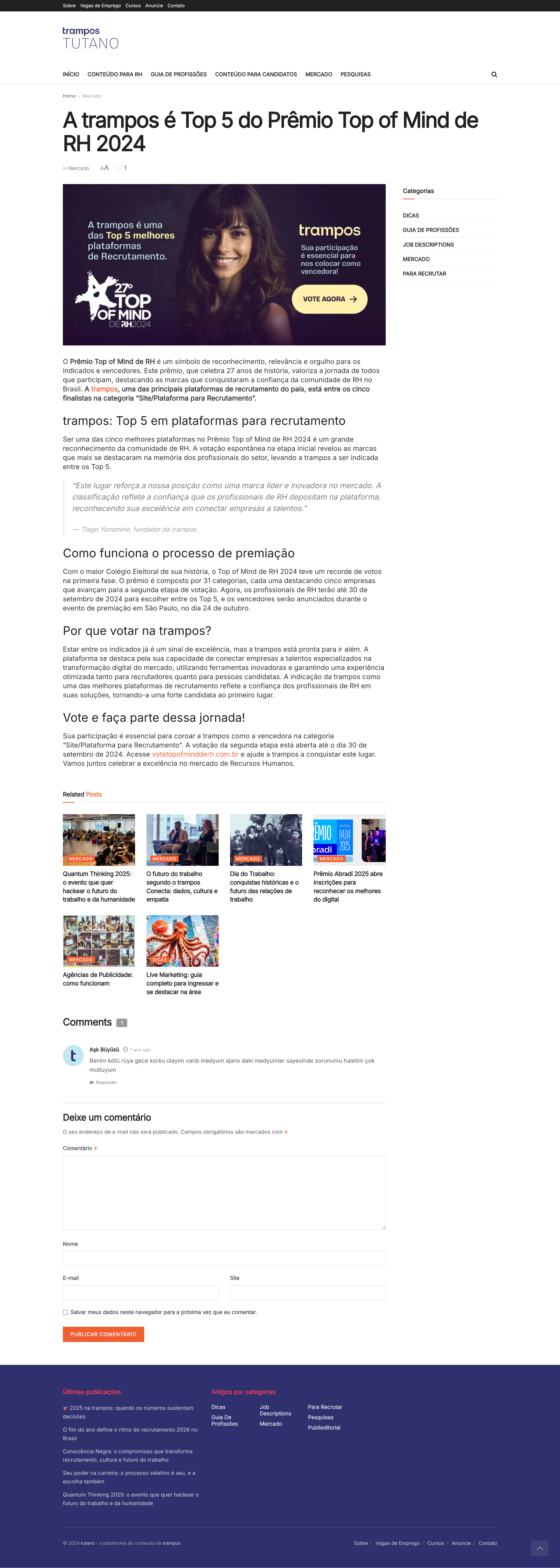 DestaqueA trampos é Top 5 do Prêmio Top of Mind de RH 2024Tutano · 1 de setembro de 2024trampos entre os cinco finalistas na categoria Site/Plataforma para Recrutamento. Citação como fundador sobre o reconhecimento da comunidade de RH.